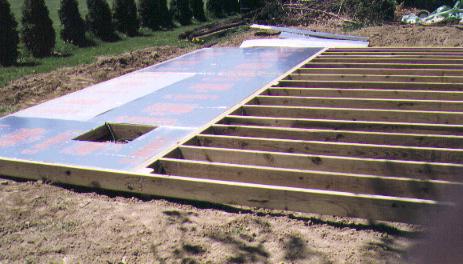 From the other angle, the rigid foam (foil faced) insulation for the greenhouse floor is visable. The inside floor-joists on the greenhouse side are lowered 1/2" to allow for the insulation thickness. This way the floor sheeting (treated plywood) layed flat across the entire joist structure. The small opening is an access hatch for the utilities.
