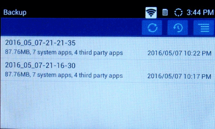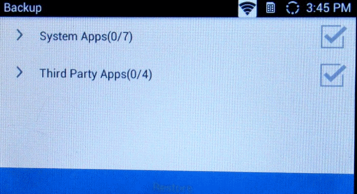 Click on the APPS icon (the 4 solid squares at the bottom center of the screen), then finger scroll left-right until you see the Backup App, press it