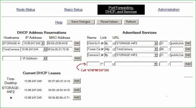 *over on the right half of the screen "Advertised Services", go to the bottom of one that is blank. Under "Name" type in "Call" space, and then your ATA adapters IP address, but add *47 to the beginning of it: yours will be slightly different than the one shown. Replace the "dots" (periods) in the IP address with " * " as shown; (star)4710(star)98(star)........