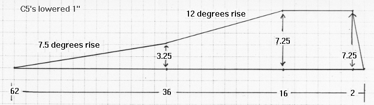 here is a diagram for ramps that should work on C5's that have been lowered 1.5" or less. I say should because I calculated these measurements. I would sure appreciate it if someone who builds these "lowered" ramps would get back to me with the results. The overall lift heigth is 8".