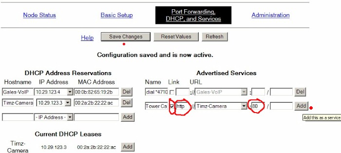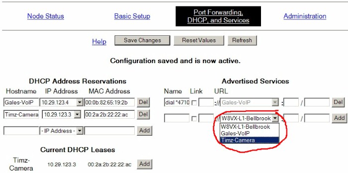 * on this screen, you should see in the bottom left that your Mesh node has assigned an IP address to your Camera (it won't be named at this point), and the IP and MAC address will be slightly different that what is shown below. This is in the Current DHCP Leases section of the screen:
