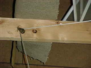 Next is the single rope , through a pulley, then to an arm attached to the door opener actuator arm (also in the pic is a white wire going to the opener door-bell switch... kinda makes it look confusing until you seperate the two)