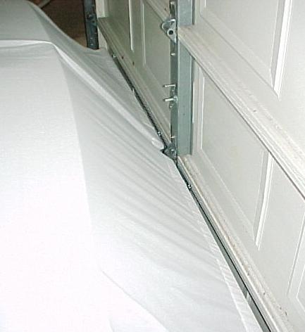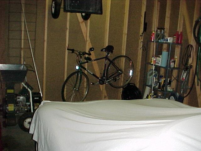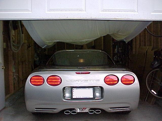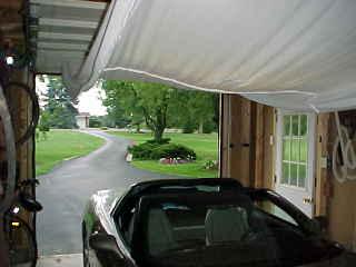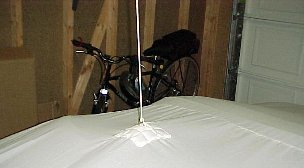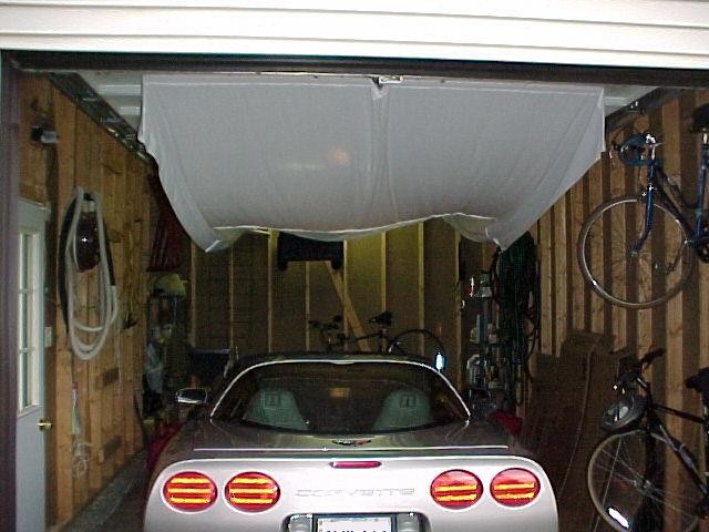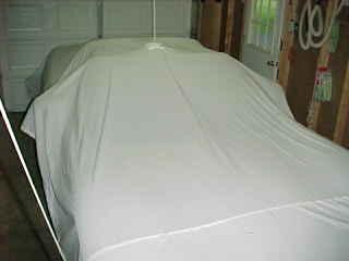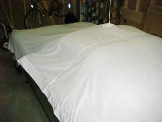 17 years later... With a couple of weeks to kill before taking delivery of my 2002 coupe, I decided to try and automate the raising and lowering of the cover; using the garage door opener as the source of the power. So off to KMart to buy 3 king-sized flat sheets; the cheapest ones they sold. Was only able to find queen-sized flat sheets, on sale for $11 each. The cheap sheets have a loose weave and was perfect since I wanted a cover that would breathe. My wife sewed them together then trimmed the length.