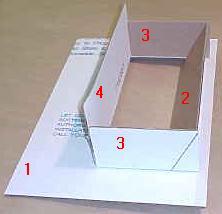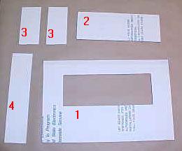 Below are the basic pieces of corrugated cardboard I cut out. BTW, I did not use white surfaced cardboard on the final product. Pictured is a prototype made of the white surfaced cardboard, I then cut out another using brown (natural) colored cardboard. Although Duvetyne fabric does not reflect any light, a small amount will pass through it (to test, hold a piece of the fabric up to a light), and this is why I did not use the white faced cardboard in the finished product.